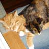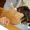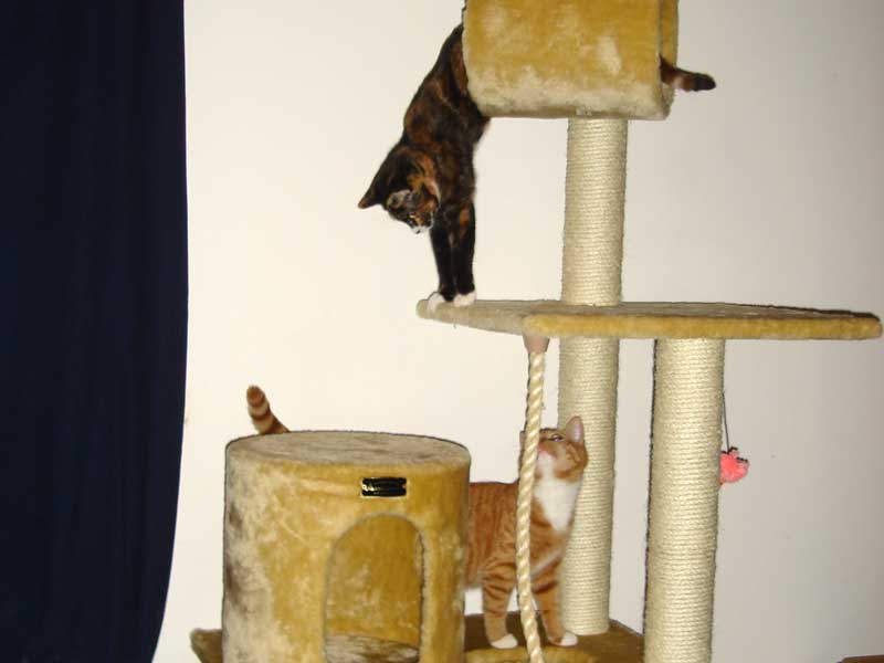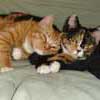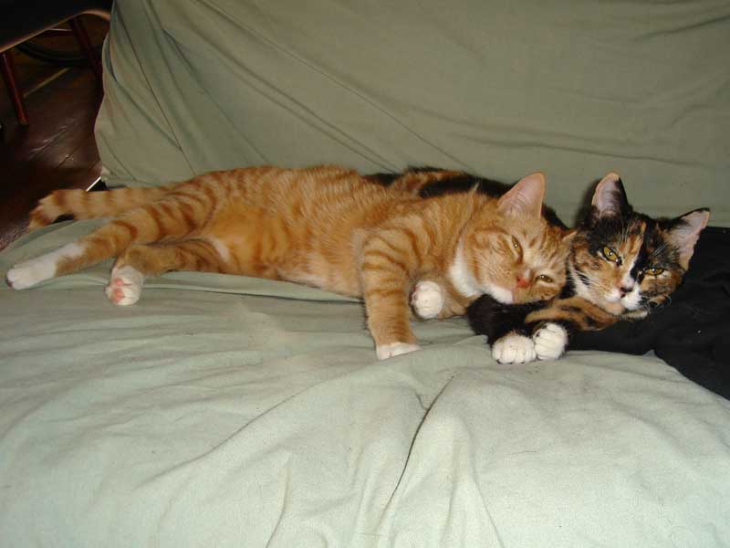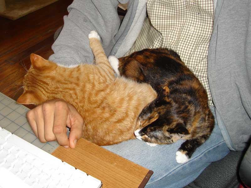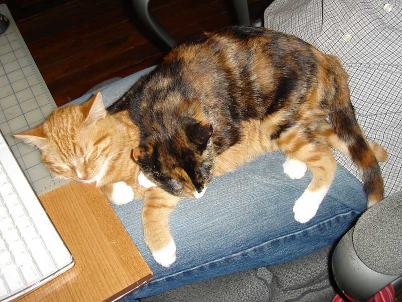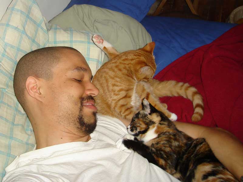 Just over 16 months ago, I said goodbye to my sweet little rattie, Macy. Life was too uncertain out here for me to even consider getting another pet. Lately though, I’ve come to realize that life will never feel completely stable out here, or perhaps anywhere for that matter. I miss coming home to loving little creatures that are unconditionally happy to seem me. As much as I loved the various ratties I’ve cared for over the years, I always felt some guilt over the proportion of their lives spent confined in cages. I began to consider the option of adopting the kind of pet that kept me company through most of my childhood: a cat. When Sandi moved in to the other half of my double-shotgun apartment at the beginning of the year, she brought her cats Louie and Punk with her. Poor Punk was old though, and passed away within days of moving in. Wanting a companion for Louie, she hoped to adopt a kitten from the owners of the frame shop where she works. Marsha and Vicki have a menagerie of pets at their home in Algiers Point, on the other side of the river. They care for about a dozen rabbits, another dozen or so cats, a few dogs, and an iguana. Among the critters, they had found four newborn kittens on the side of a road in October of last year. They nursed the kittens to health, bottle-feeding and all. Marsha and Vicki grew a particular attachment to Scout, who reminded them of a previous pet. However, they wanted to adopt out the other three to loving homes. Hoping not to split up the siblings any more than necessary, Sandi proposed that she would take the orange male Redford, and I ought to take in the two sisters, Estelle and Kong. I was initially still hesitant to accept the responsibilities of kitty fatherhood, but I did like the idea that the sisters could keep each other company when I’m not home. After a few more weeks of hedging, I finally agreed to go see the kitties. I was a little worried that kittens separated from their mother at such a young age might be maladjusted, but that concern was alleviated as soon as I played and cuddled with the babies. These were some of the most affectionate, “normal” kittens I’ve ever seen! Last night, Marsha and Vicki brought them over, and they immediately settled in to their new homes. Seeming not at all distraught by their new environment and their separation from their previous family, Estelle and Kong have been nonstop “purr machines.” They nuzzled up next to me throughout the night, reminding me how much pleasure companion pets bring to one’s life. I’m sure kitty fatherhood will present some challenges, but I’m so glad to have these adorable little sweeties in my life.