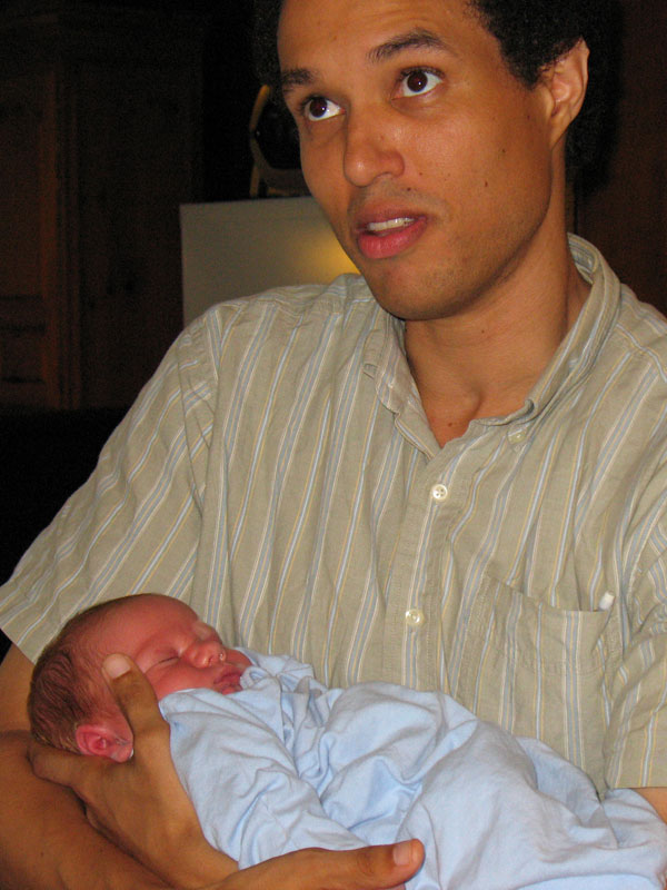 First of all, the end of a school year tends to make me all introspective and reflective and contemplative and pensive and (insert word here)-ive. At the end of May I braced myself to resist believing that I could actually care about those no-good, worthless, soft-shelled, pseudo-students. Throughout the summer I’ve been weathering the temptation to think fondly of them with only moderate success. In my weakened emotional state, the touchy-feeliness of GNOWP suckered me into kinda exploring my feelings, and squishy sappy crap like that. We keeps it real on tha Mathside, and that writing class ruthlessly assaulted my naturally-thuggish sensibilities. The chicks that comprised the majority of the class kept bullying me into sensitive realms such as sharing emotions with each other. It was brutal, bro. Then, like a one-two sucker punch, a barrage of beautiful baby boys bombarded Big J. Margaret, one of four facilitators for the writing project, missed almost the last two weeks of class lest her big basketball belly burst. She finally gave birth on July 2 to Aidan James Albert Greiner, who measured in at a whopping 9 lb 9 oz, and 21 inches. I don’t tend to gush over newborns, as such tendencies clearly violate the Mathside Gangsta code of conduct. However, I’ve had two occasions so far to visit Margaret, her husband Chuck, and Aidan. Oh god, he is sooooooo cuuuuuuuuuute! In a nefarious plot to further chisel away at my rock-hard exterior, the parents encouraged me to hold Aidan. I yanked him up by the nape of his neck like a mother cat. What? Two hands are recommended? Okay. With a little guidance I learned the proper way to hold a baby, which naturally lures the unsuspecting gangsta to gaze into the infant’s eyes, listen to his coos and gurgles, and admire his wholesome innocence. Awwwwwwww! Soooooooo frikkin’ preciooooooous! Then, as if Aidan wasn’t already compromising my hard-core street cred on his own, the date of my second visit bestowed a new life into my own family. Joshua James Matlin-Heiger was born on July 14, measuring in at 7.0 lbs and 20 1/8 inches. My cousin Beth, her husband Neil, and their first child Jacob are all thrilled to welcome him to the club, as are the rest of our family. While I was not with them in Boston for the joyous event, I can now imagine what it must be like to hold him and look into his darling eyes. Adooooooooooorable!