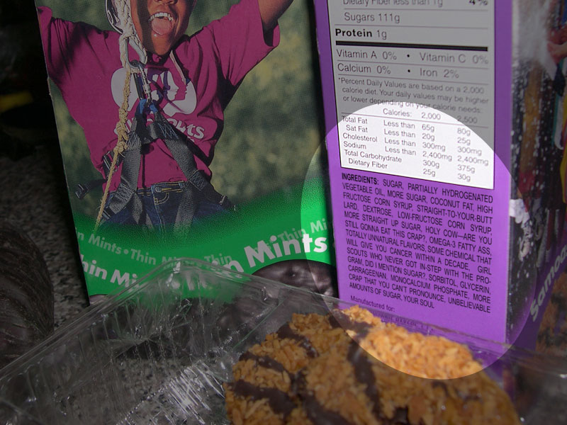 Junk food peddlers“Training today’s girls to be future hustlers.” If the Girl Scouts are seeking to update their motto, there’s my suggestion. According to their own website this nefarious cult has currently sucked in 3.7 million girls nationwide. Every year just before spring they disperse from the murky shadows to invade our workplaces, supermarkets, and schools with colorful boxes of dangerously addictive dessert wafers. “Enabling your chronic obesity through guilt-inducing sales tactics by scheming wide-eyed girls everywhere.”