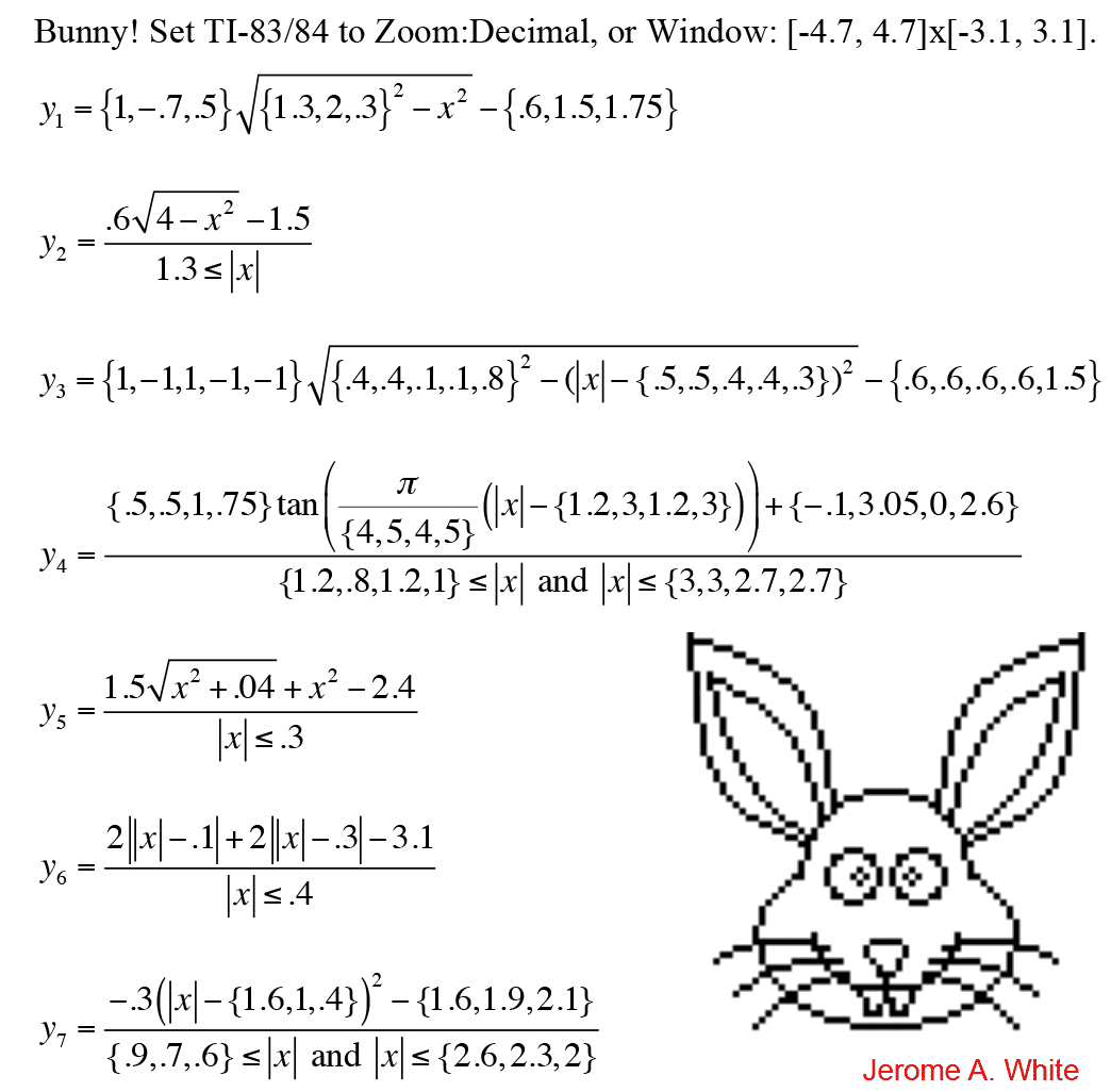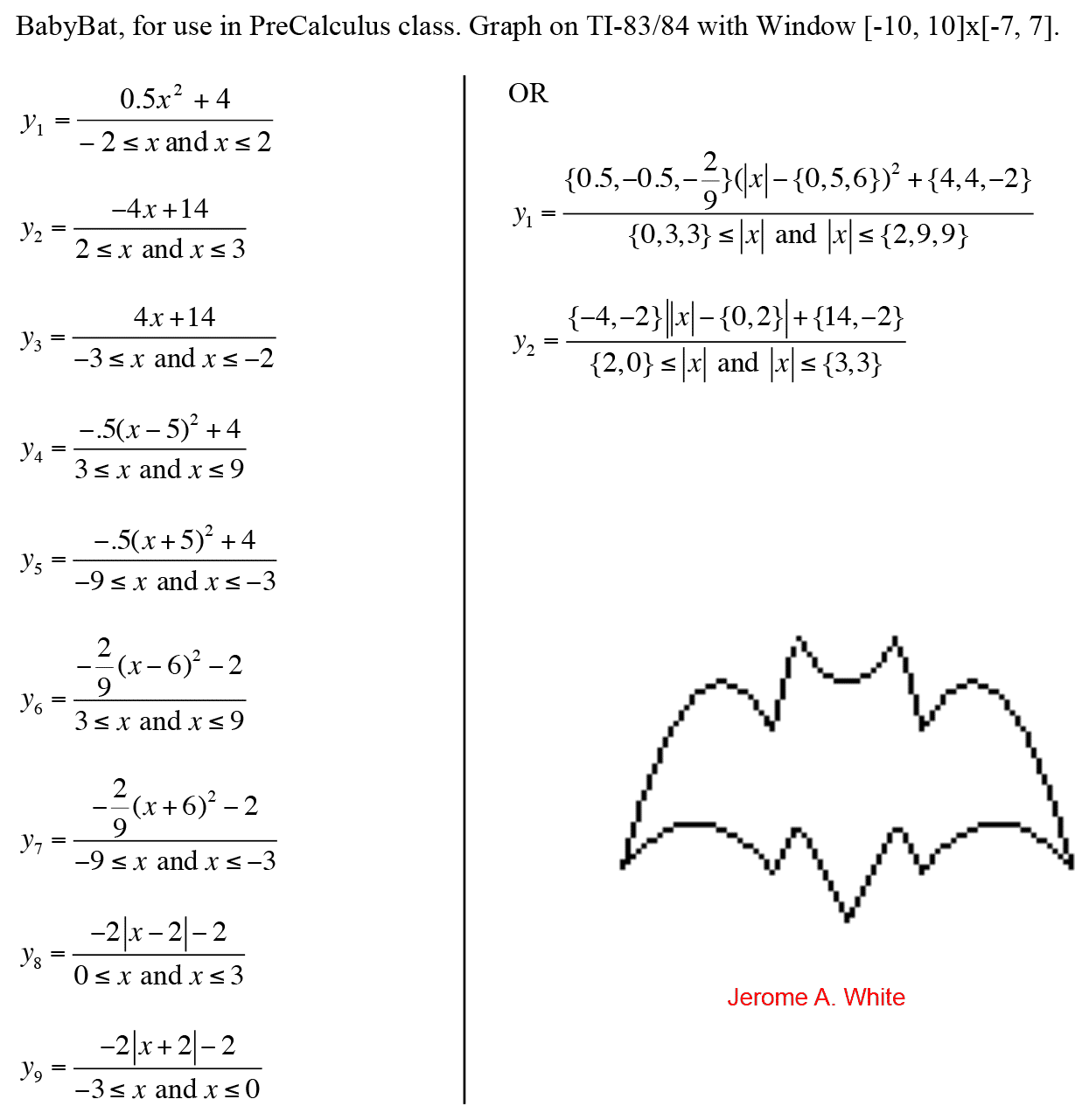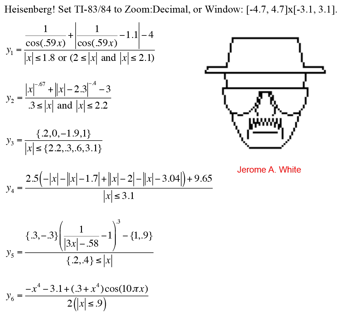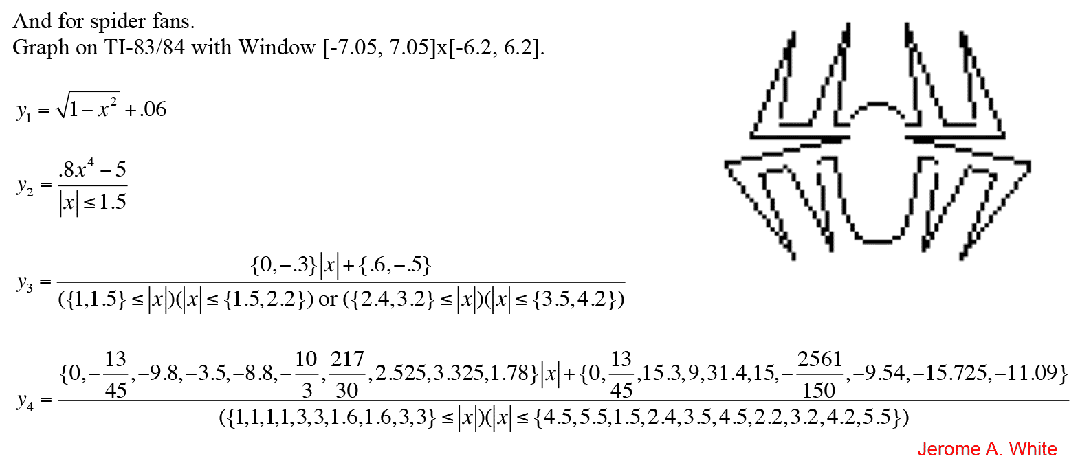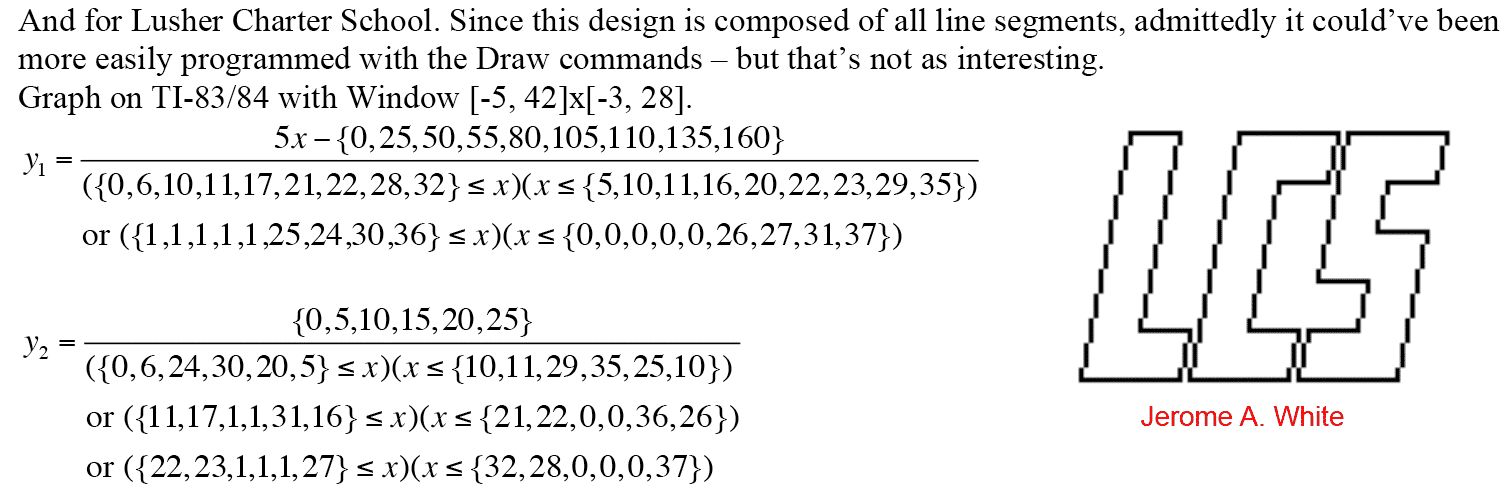 summer 2015 - Starting with an email request from a stranger, I set out to find a way to graph an entire design with just a single pair of parametric equations. The initial "jaw" logo utilized piecewise definitions, and even the second "jaw" logo used a different equation pair for each letter. Thereafter I used a variety of techniques and even included jump-discontinuity functions to incorporate multiple distinct pieces into a single equation pair.